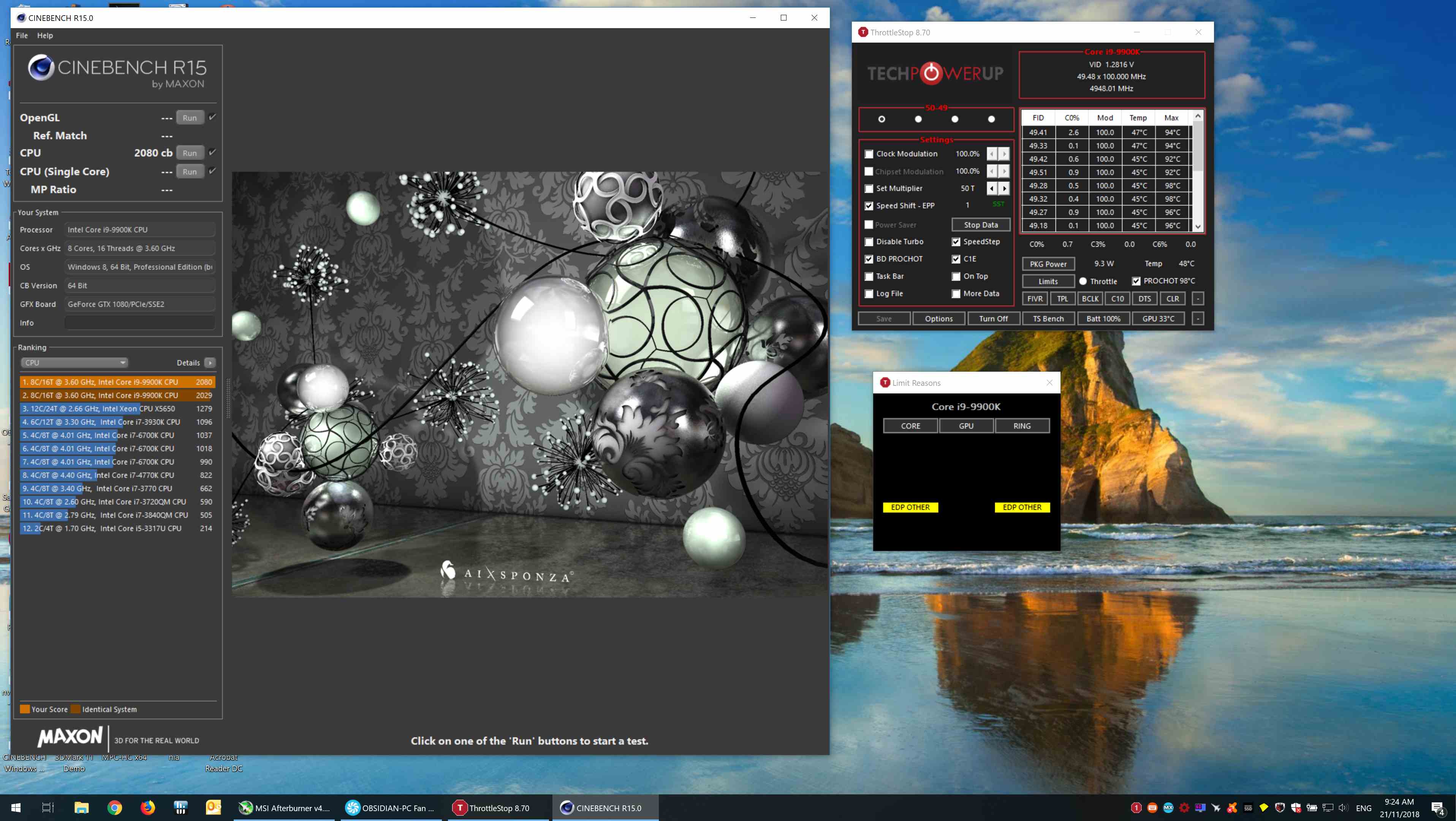 A consumer 9900K (not a chip from the lab) will hit 2150/2200 cb easily. So the firmware is holding you back already and you don't have much thermal headroom available of you want to let the 9900K spread it wings. -
