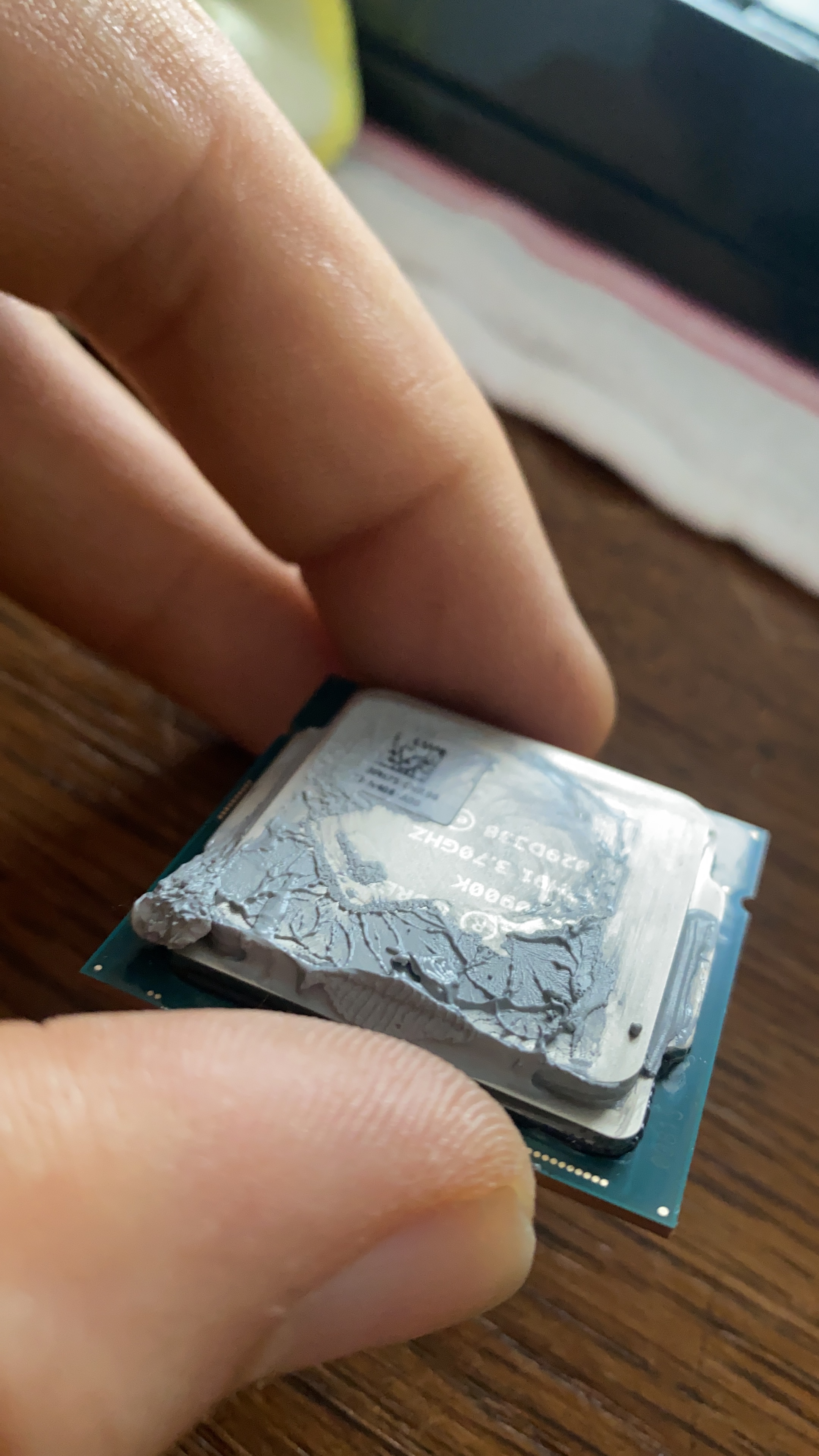 So I delidded the CPU and what I got was this! Liquid Metal between Die and IHS!? WTF???? Of course completely dried up, so I don't have any clue how to remove this!