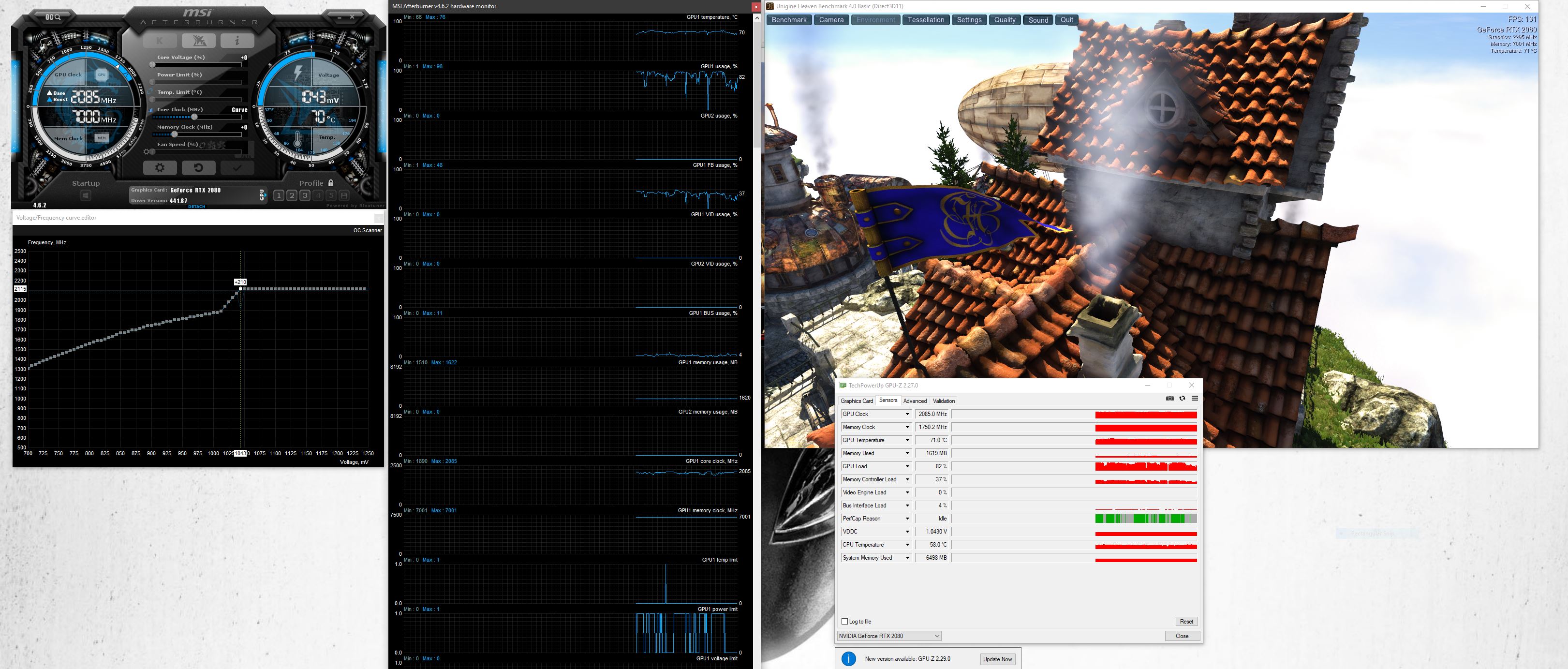 Using the voltage curve, I can get the card running steady at 1935MHz at 900mV. Temperature peaked at 71, and might have hit 72 given some time, but it was fluctuating anywhere from 67 to 71 degrees. This is all on the balanced fan profile.