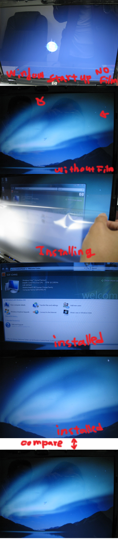 From the pictures you've sent seems like a little difference, Why not buy a anti UV glasses instead of installing an anti-glare screen. You still can use it while watching T.V. or playing games (that is if you have eye strain due to prolong usage of PC). -