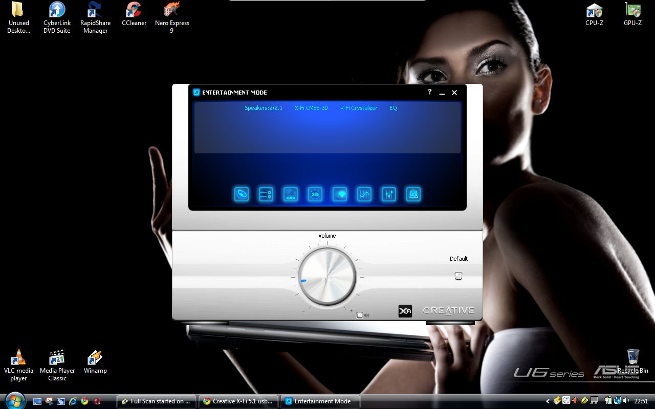 Now i have noticed that windows media player I've got with windows vista sounds much better "crisper and louder" than the creative player. The option they've got "creative" for SVM and crosshatching actually makes the music sounds worse...