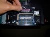 Now, my question is how to install the two new DIMMs I bought (you can see the bottom edge of them and their package at the top of the picture) to replace the single one inside the notebook. There is also a clear, plastic screen that you can see me lifting up with my fingertips. I'm sorry if these questions are noob, but I don't want to risk breaking anything!