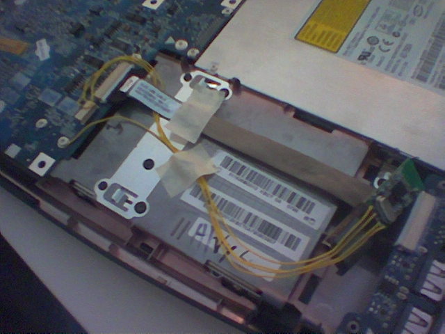 Wrap all the usb dongle with insulant tape to prevent any short fuse on the laptop board, stick it with some adesive tape in the empty space of the board at left of memory modules, and close the bay.