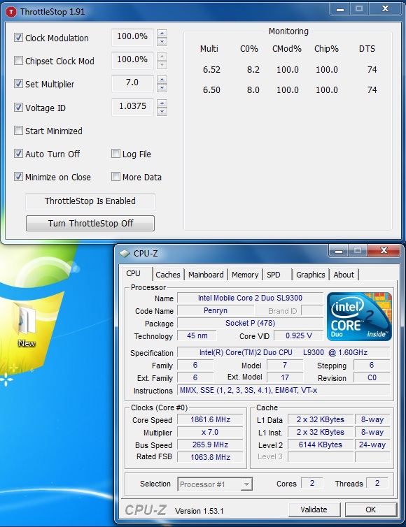 thendless: Core 2 CPUs use two different formulas for VID; one formula for desktop and a different formula for mobile CPUs. ThrottleStop doesn't realize an SL9300 is a mobile chip so it is blocking access to SLFM and using the wrong VID formula. I'll try to get that fixed up tonight. Thanks for bringing that to my attention. Can you post a screen shot of CPU-Z so I can make sure that I get this right?