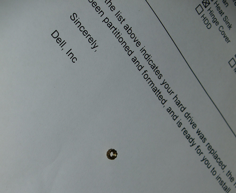 Things got a wee bit more irritating as I removed the back panel to reinstall my original #1 HDD; since I am pretty sure Dell removed the #0 HDD I left in the computer when it went to Depot, they apparently got lazy, or simply have little pride in workmanship - one screw is missing from the HDD cage. Pain in the butt now I have to find another little friggin screw. Additionally when I turned the computer slightly side ways just before putting the battery back in, a very tiny (about the size of a HDD screw) gold colored gear-like piece fell out! I never saw anything like this before so of course have no idea what it goes to. I just stashed it in a zip-lock bag until I either figure it out or just get tired of looking at it and toss it in the trash.