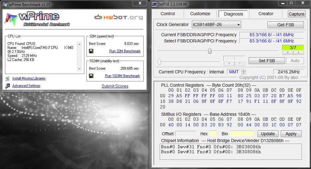 Been busy so never had a chance to play with setfsb until today.So clock generator @ ICS9LPRS365BGLF hit get fsb in diagnosis,First edit 00h from 21 to 29 in Hex box then hit update,Then edit 0C from value 0D to 20 hit update,Then edit 0F from value D8 to 95 hit update,Then edit 10h value 31 to 34 hit update.Then i hit apply & it either bluescreens or freezes.Tried values 31 right up to 34 for 10h same bluescreens or freezes.What am i doing wrong