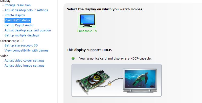 Thought I'd check it out and it IS down to the hardware as far as I can see. Seems you need a HDCP compliant device - probably only TV's and projectors. I get an extra menu item in the driver when the TV is connected.Attached Files: