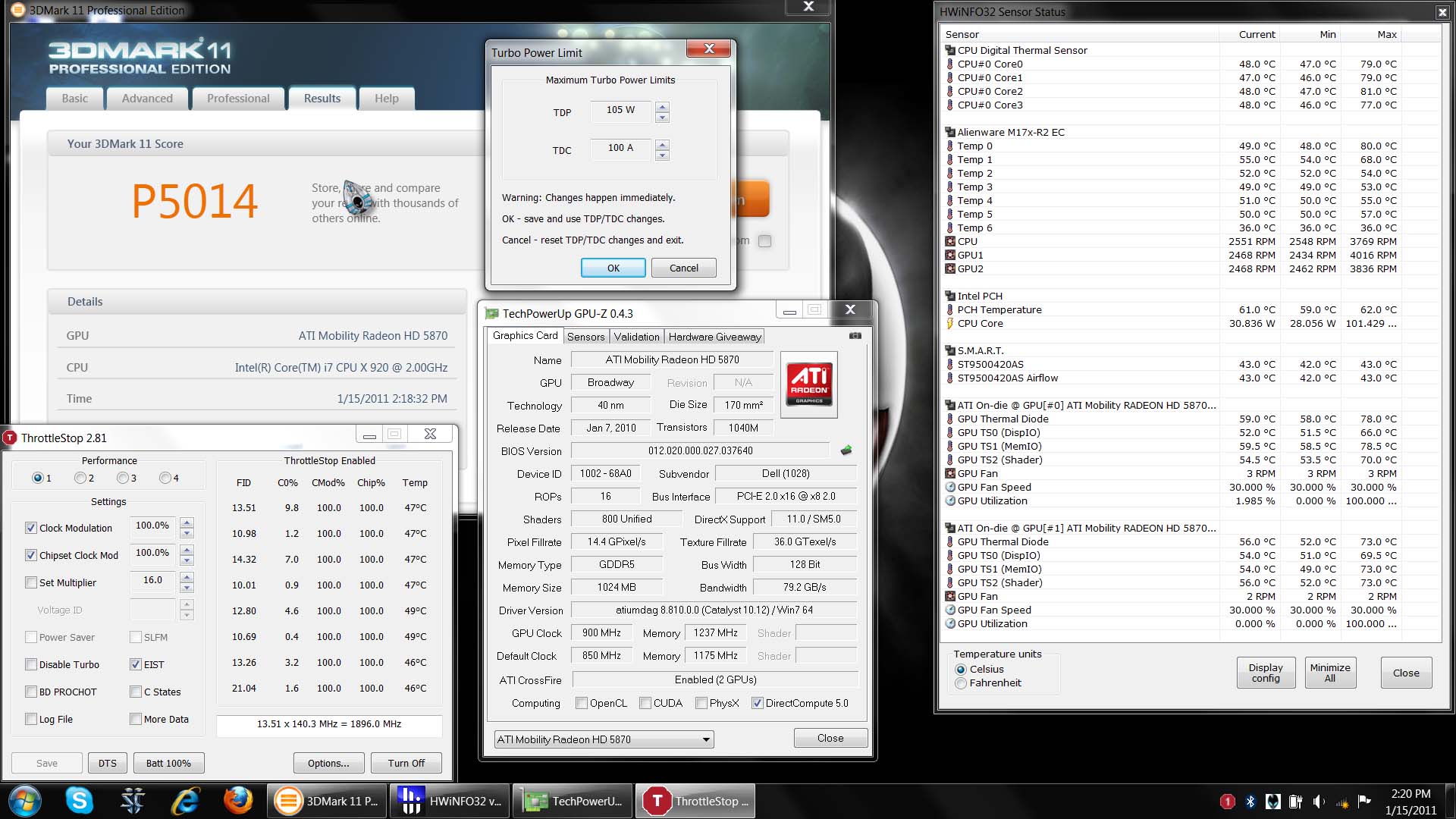 System: Core i7-Q840 @ 1.87 GHz | 6 GB Stock RAM | Crossfire ATI Mobility 5870m (bout to test at 760(core)/1100(mem) | 320 GB SATA | 1920 x 1200 RGB LED (probably make a sig later...) -