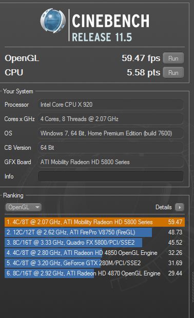 Yup I'm finding I get better system performance (GPU and CPU) if I keep voltage at default and just raise TDP + GPU clocks. I maxed the cinebench CPU test at 5.62 earlier but forgot to save it. What I noticed is that these sort of tests are very short in duration so they probably give inflated scores to the sandy bridge CPU's thanks to TB 2.0 which temporarily goes above their set TDP for an x amount of time. I bet if we run 1024 MB Wprime 1.55 tests, SB mobile will show its true colors. One Asus G73SW owner with a 2630qm ran Prime95 for an extended duration and saw his CPU speed drop to 2.3 GHz. That's 1 ghz slower than my 920xm with TS..lol. Anyway, it's good to have a 920xm again, I got sick of that weak sauce 720qm. Time for some bad company vietnam at 60+ fps glory