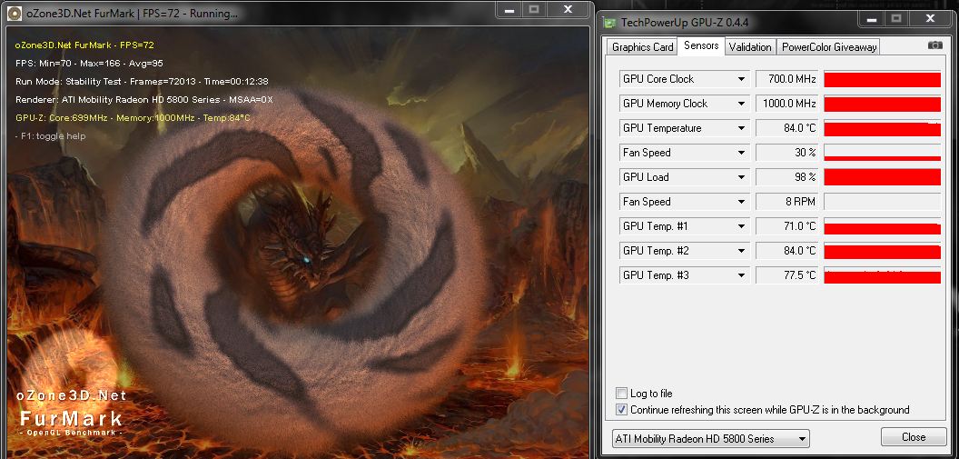 THe temp were observe from GPU-Z.0.4.4 while running FurMark (Multi-GPU) 640X480 window. -