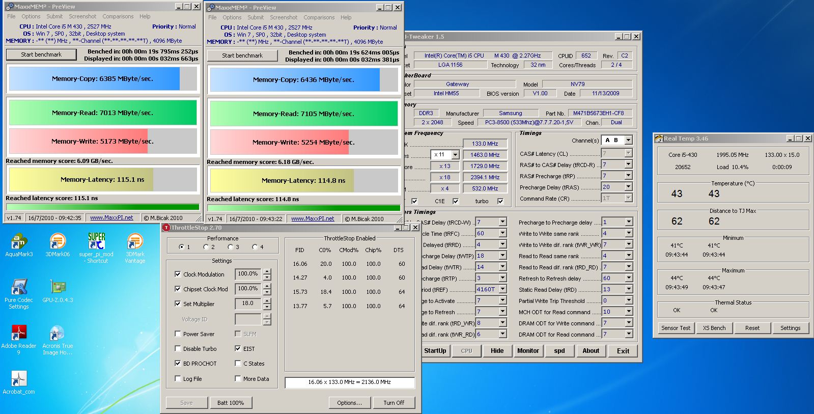 ( because it is so awesome otherwise). I did a test with just a fresh boot, speeds are where they "should" be (8500 MB/s read). Then I started ThrottleStop but did not change any multi or voltage and ran it again - Clock Mod% and Chip Clock Mod % both were forced to 100% (from last time I used the program). Dropped to 7200 MB/s. Turned off both of those features, same thing. Turned off ThrottleStop, same thing. So When ThrottleStop is enabled, it is doing something that is hacking memory bandwidth down. These were all done at 8.5x 1333/1333. The clocks were never changed.