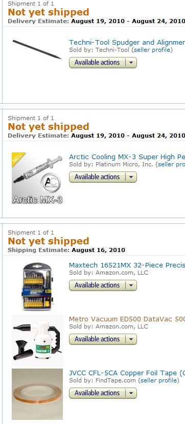 Just bought a bunch of new goodies. Hopefully the copper tape is at least 90% cu, I plan to wrap the sinks with it to increase cooling surface area. Going to do the retention mod like Ash and others are doing so I got me some new MX-3. Figured compressed air cans were a giant waste of money since they lose pressure quite easily and they run out too often so I bought a high pressure vacuum. Got me a plastic tool to use for the M17x while I was at it: