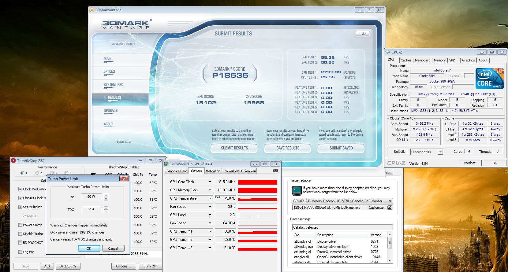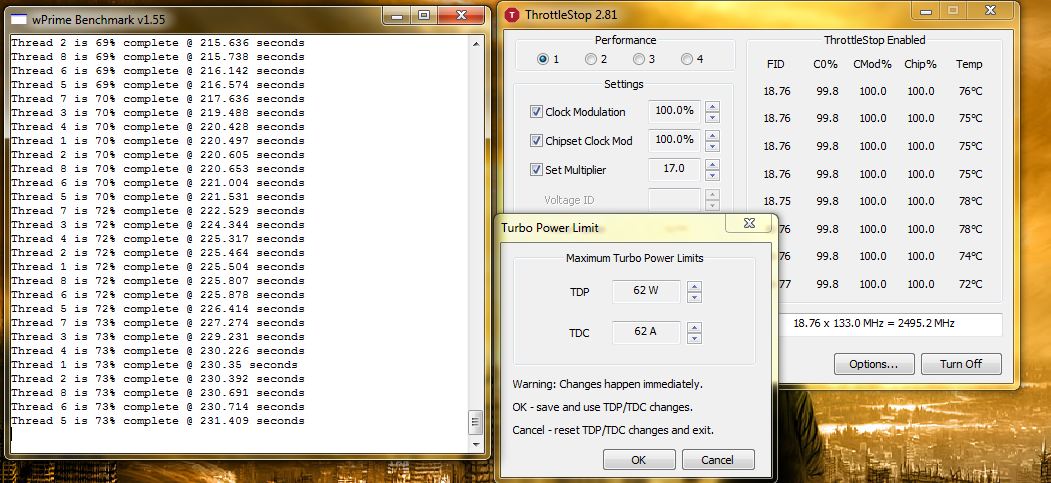 These are the max temps at stock TDP with all 4 core/8 threads active. I posted pics + discussion about the CPU mod here: http://m17x.freeforums.org/retention-mod-more-on-cpu-great-temps-at-least-for-me-t17.html Keep in mind my ambient temp is pretty high since it's hot here in California right now. My room temp is always 75F and above.Attached Files: