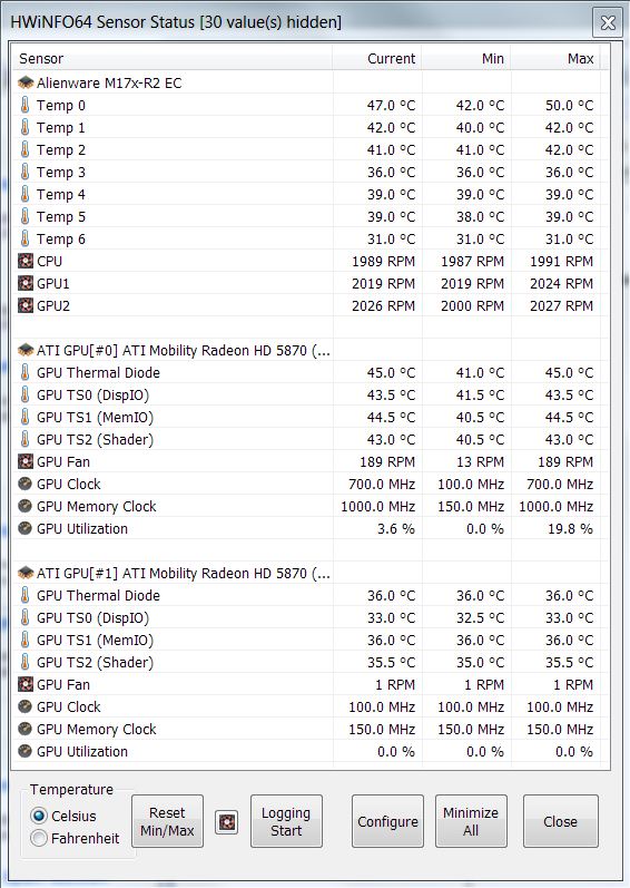 Thanks for the tip on the GPU fan speed - I was wondering about that. I only see one GPU under "Alienware M17x-R2 EC", however (see attachment). Does this mean the cards or HWinfo or something is configured incorrectly? By the way, I made sure to disable ULPS - if that matters.