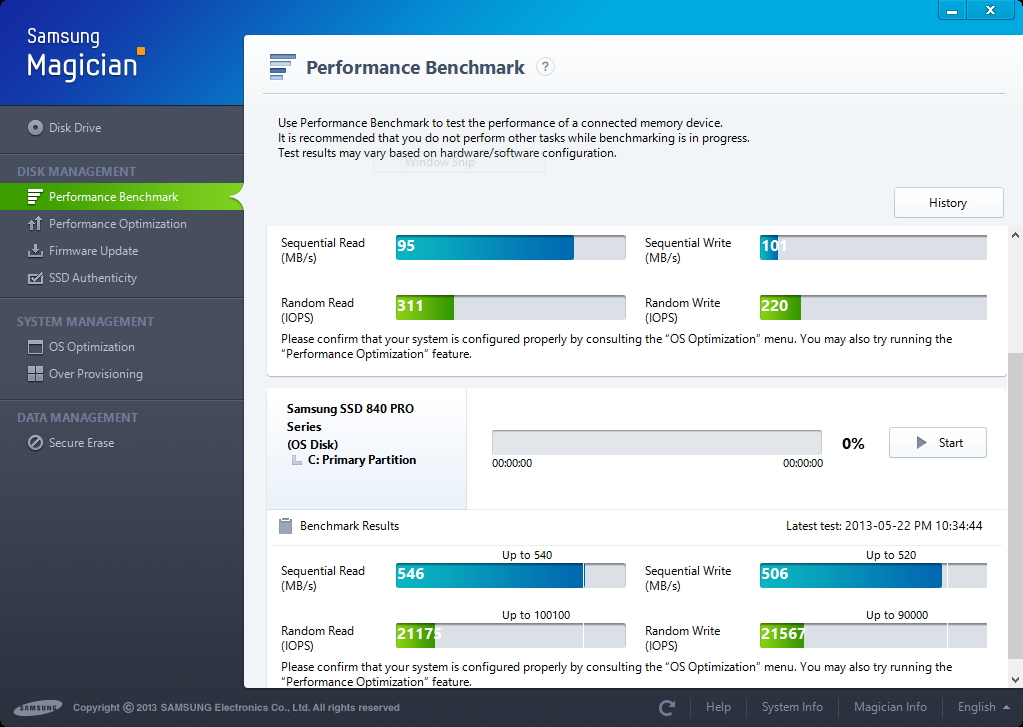The 840 Pro has been great. It scores 8.1 in WEI on Windows 8, which is the highest a single SSD can score. Reading/Writing at .5GB a second is no joke. I extract, zip, and install huge files in a fraction of the time it took on my previous 2x 7200RPM HDD Raid 0 setup. Boot time is < 10 seconds now, which is a major improvement over the ~45 seconds it used to take. As I've made clear above just don't trust the benchmarks in Magician. You should still install the program to keep up to date with the proper firmware and to manage the drive though.