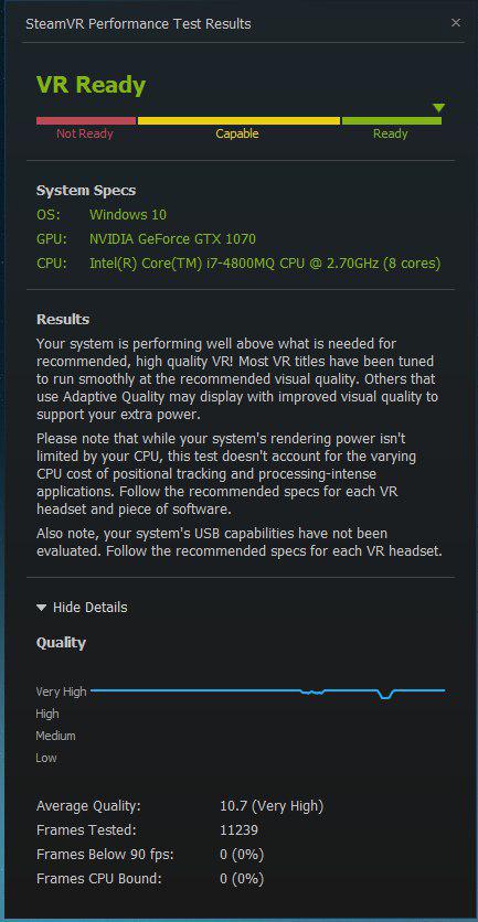 Using steam and oculus compatibility tests everything seems to be fine with the specs (results in the files), but I was wondering if I would be limited by the displayport and/or the USB.