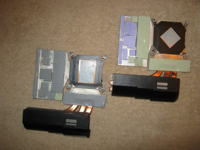 Below are photos comparing the AMD heat sinks to the NVIDIA heat sinks. If you are considering upgrading to 7970M from an NVIDIA GPU, you will need to purchase heat sinks. The heats sinks for the 6970M/6990M will fit, although they are not quite as beefy as the heat sink designed for the 7970M. Also provided is a comparison of the QM CPU heat sink (single-pipe) to the XM CPU heat sink designed for the M18x R2 (triple-pipe). This part is a direct fit.