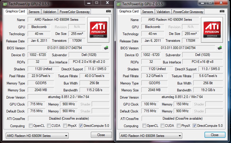 EDIT: @Aiki - look back at your GPUZ screen shot. Look in the Bus Interface field and you will notice that one card is missing the "2.0" on the PCIe bus. The card that is missing this detail is definitely defective. This is another identical symptom to the problem with my first set of 6970M cards.Attached Files: