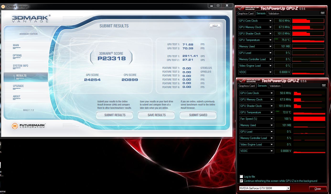 I just pulled off my 2 best 580M runs on 3DMark11 (P7226) and Vantage (P26010), and dog-gonnit, I forgot to save the Vantage result online after saving the screen shot. I ran it again at got slightly less.