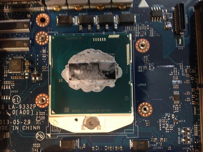 My 4930mx has started to overheat recently (stock clocks). I decided to peek inside and take a look at my thermal compound. Here's what I saw: