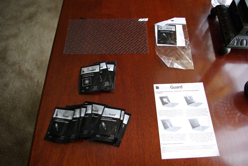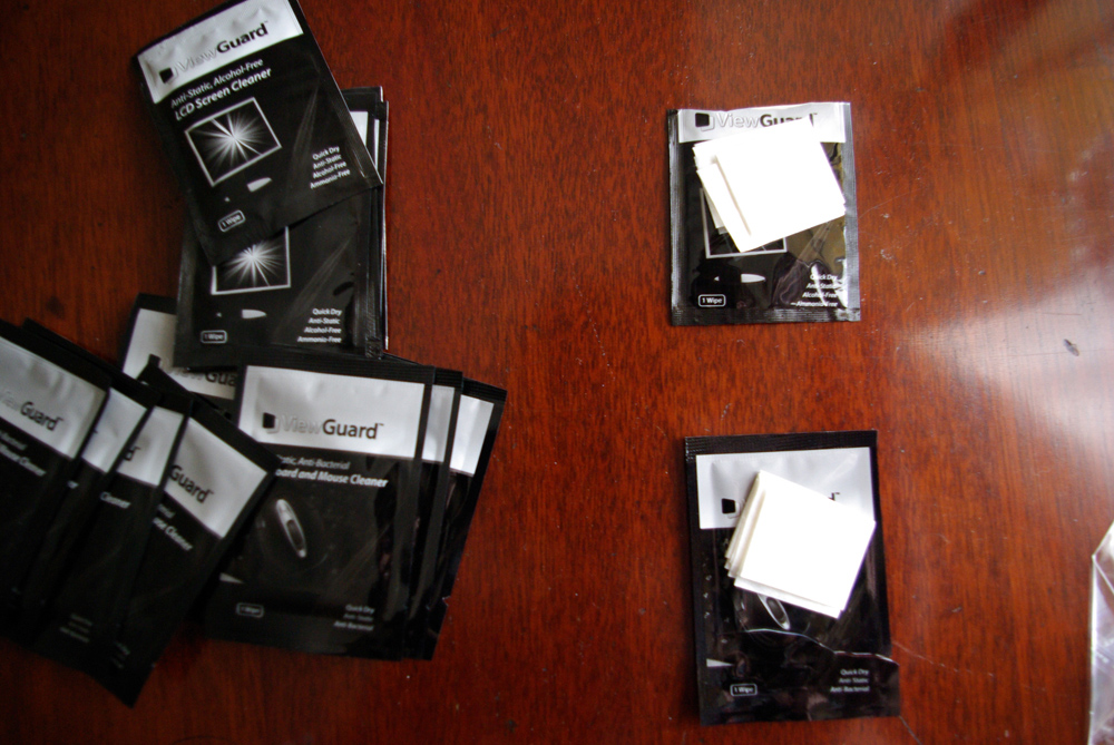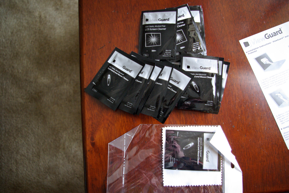 Alright, the first photo shows everything in the package. There's a couple of LCD wipes and a lot of keyboard/mouse wipes, which just seem to be stronger LCD wipes. There's also a microfiber wipe which they advise you use to wipe off your screen before attaching the cover.