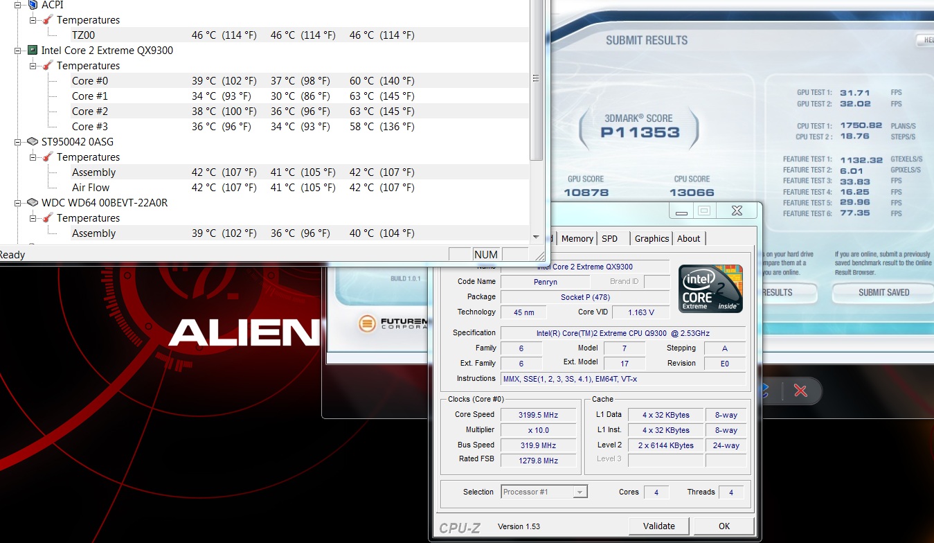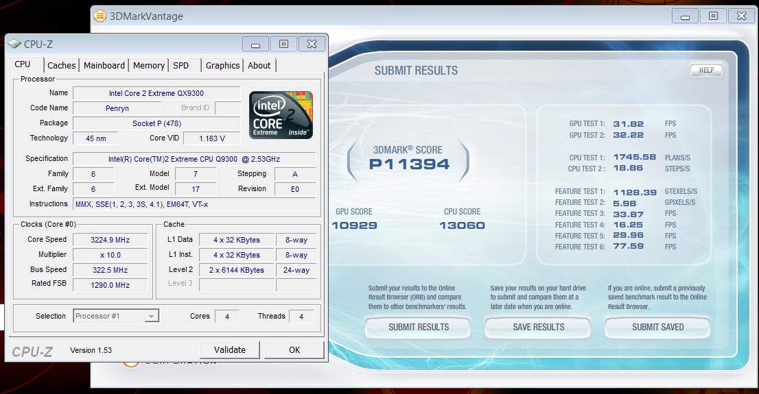 Here is my first OC Benchmark with the QX9300 with the mem @ 1280 and FSB at 1280 with a mult at 10