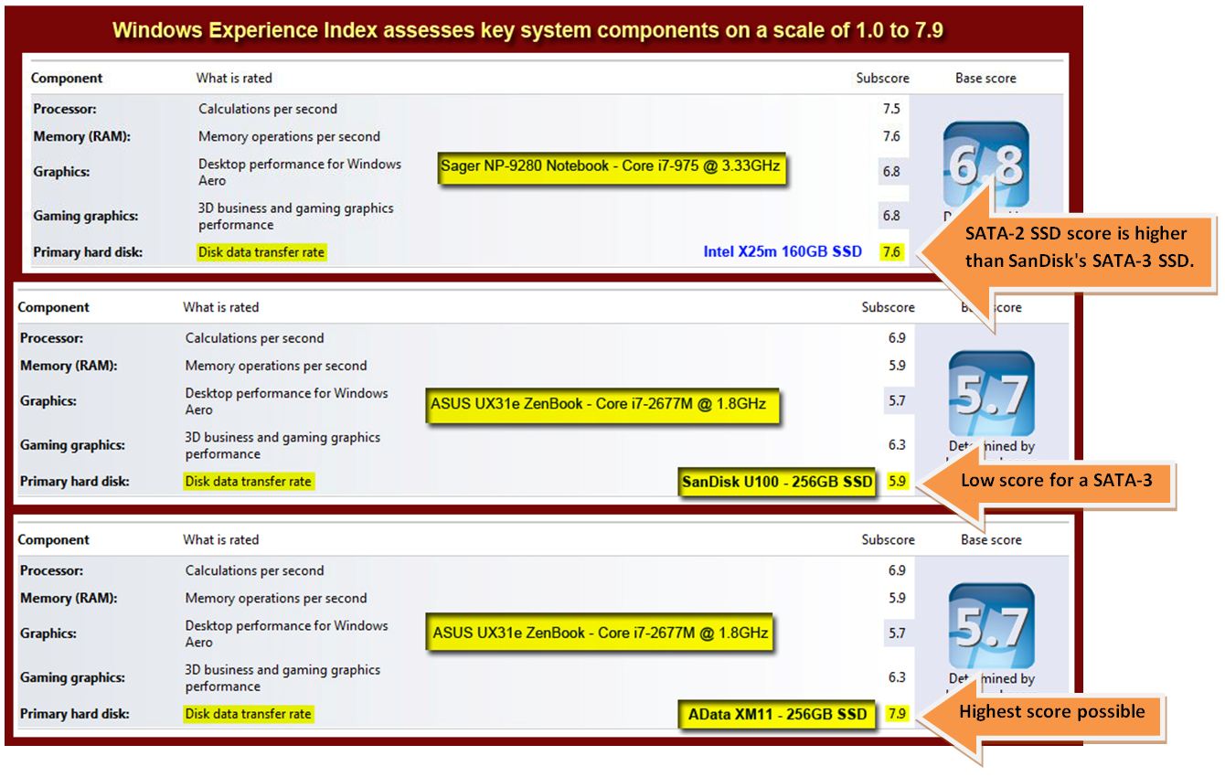 Take a look at these numbers (below). It seems my year-old Intel X25m SATA-II SSD (3Gb/s) out-performs the SanDisk SATA-III SSD (6Gb/s) in most bench categories. That is pretty poor performance for a 6Gb/s SATA-III SSD pitted against a SATA-II drive. Only SanDisk's Sequential READ/WRITES stand out compared to my old Intel SATA-II SSD; but in all other categories the SanDisk loses, and particularly loses in the overall total scores. And compared to the ADATA XM11 SSD, the Sandisk falls apart in six out of the eight categories. Perhaps ASUS has a legit reason for this mis-match in key performance components, but it sure seems to contradict its earlier well-publicized partnership plans with ADATA Technology. Comments and criticism are welcome if I am missing something here.Attached Files:
