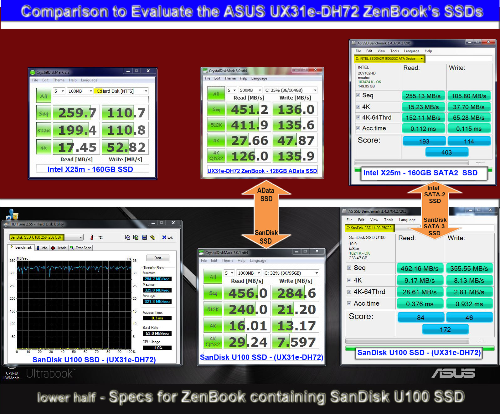 After some extensive research on the ASUS UX31e-DH72, I bought one based primarily on the several ASUS & ADATA news releases touting their partnership and plans to incorporate the SandForce-driven ADATA XM11 SSD in the UX31 ZenBook. After receiving mine and discovering a SanDisk SSD inside, I did more research and testing. Based on both personal testing and the test results from AnandTech.com and other reviews -- it seems that the ADATA XM11 256GB SSD is significantly better in performance in most benchmark categories than the SanDisk U100. The numbers suggest that the SanDisk U100 performance is worst than 2nd tier SSDs. Unless there are undisclosed reliability issues or existing SandForce controller problems with the ADATA XM11, I cannot understand why ASUS in striving for high-performance in their UX31 and then puts the much lower-performing SanDisk U100 SSD in tandem with Intel's Gen2 i7-2677m, 1.80/2.90GHz Turbo2 processor.