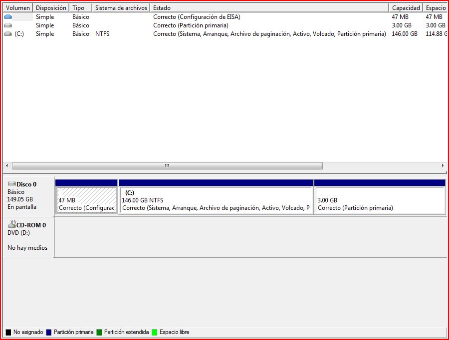 I have three volumnes, one is C (146Gb with sistem, boot, etc etc/NTFS), another with 3Gb(Primary Partition ) and other with 47Gb (EISA Configurtion).