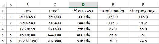 Sleeping Dogs is Ultra w/Extreme AA right? 24.5 FPS @ 1080p to 91.2 FPS @ 540p is a 3.7x increase in frame rate for a 4x decrease in pixels. I'd say that's pretty close to linear. -