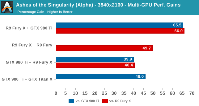 Interesting to see the latest round of Ashes DX12 benchmarks, comparing performance from mixing your AMD and Nvidia cards together: Red + Green > Green + Red
