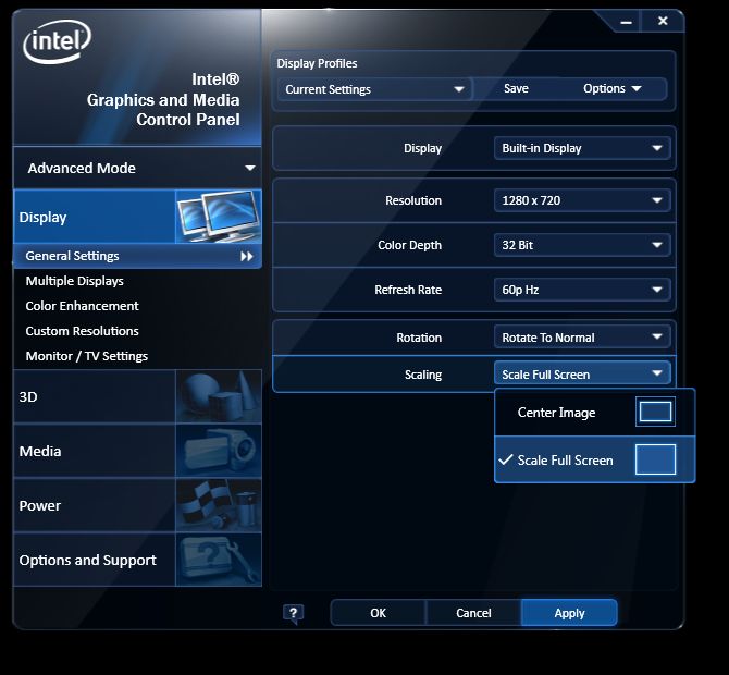 Assuming you have Optimus, you will have to manage scaling using the Intel GPU options.