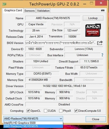 - Graphics chipAMD Radeon R9 M375 + Intel GMA HD 5500