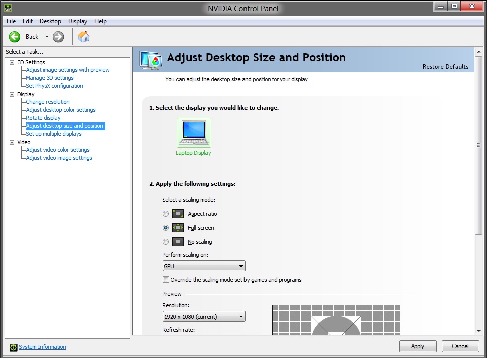 Laptop displays are different, What you are talking about is Scaling AFAIK you can't change the scaling on a laptop screen. You can check to see if you can change it through the Nvidia control panel in the DISPLAY section. I know you can't with ATI cards because the option is grayed out until you hook up an external display and then you can use the Scan settings to hide the black bars, but it won't affect the laptop display. Only an external display, but check out the Nvidia control panel see if you can.