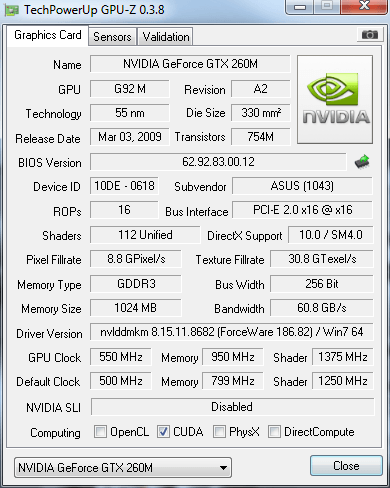 EDIT 2: Also, in 3DMark06 results, my GPU shows up as a GTX 170M online (although in the program it says GTX 260M), if that's any help at all (you've labelled the 9800M GS as the GTX 170M in your chart). -