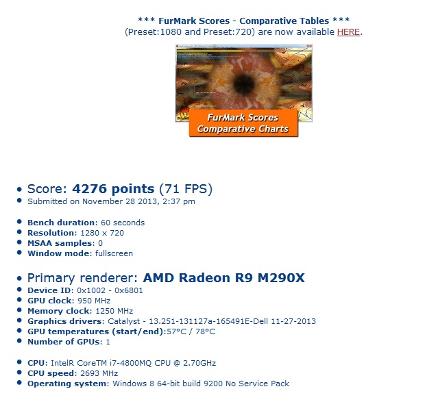 just run FurMark v 1.12 with my 7970m at 950/1250 like m290x on the pic and got only 2650 points and avg fps 44, so if this pic isn´t fake and my scores are correct it means m290x isn´t a rebrand :thumbsup:long2905 likes this.