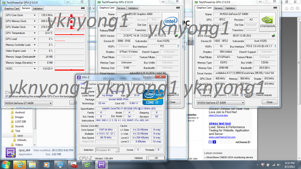 GPU-Z recognised the NVIDIA Geforce GT 640M with high accuracy due to preliminary support for NVIDIA Kepler already added by the developers. The GT 640M is shown here with idle clocks of 135/270/405MHz, with an idle Core voltage of 0.8120V. An unprecedented chilly idle core temperature of 32C is seen; the NVIDIA Geforce GT 640M is indeed a cool-running card.