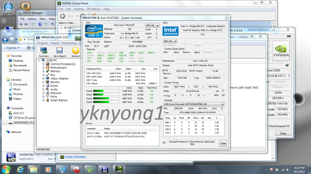 The Acer Aspire V3 uses Intel next generation HM77 chipset, Hynix 6GB DDR3-1333 CL 9-9-9-24-1T, 1.5V.