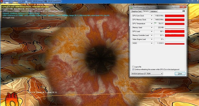 As mentioned earlier, 700M series comes with GPU Boost 2.0. Meaning it will clock even higher if the temperatures allow it. Turns out the GPU Boost clocks the GPU all the way up to 1190Mhz(LOL) doing a Furmark run. Max temperature is 79C during that run that lasted 17 minutes. On Furmark!!!