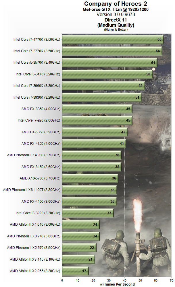 It's not just me saying it, the numbers don't lie. Overclocking the i7-4770K by 1 GHz yields no improvement and you actually lose performance going from Ivy Bridge and Haswell to Sandy Bridge-E. The only Intel CPU outperformed by AMD ones in the TechSpot graph is the Core i3. It's sad how an almost 5-year-old CPU like the i7-920 can keep up with AMD's latest-and-greatest in this title. I don't see any argument that can be made for AMD's lackluster showing in this game and it loses big-time in both top-end performance and price-to-performance ratio to comparable Intel chips. You want an apples-to-apples comparison? The FX-8350 gives up 16 FPS or 35% to the i5-3570K. It doesn't get more clear than that.