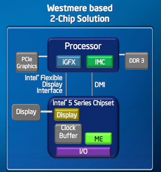 For Intel dual core, a 32nm cpu will combined with a 45nm Intel gpu, and if there is an ATI or Nvidia card, it will have switchable graphics. This will be a 2 chip piece (cpu on one chip and gpu on another) connected like a Pentium D or Atom 330 processor (like 2 single core cpu's connected together). Then, for the next platform (Sandy Bridge), the cpu and gpu will be on a single die.