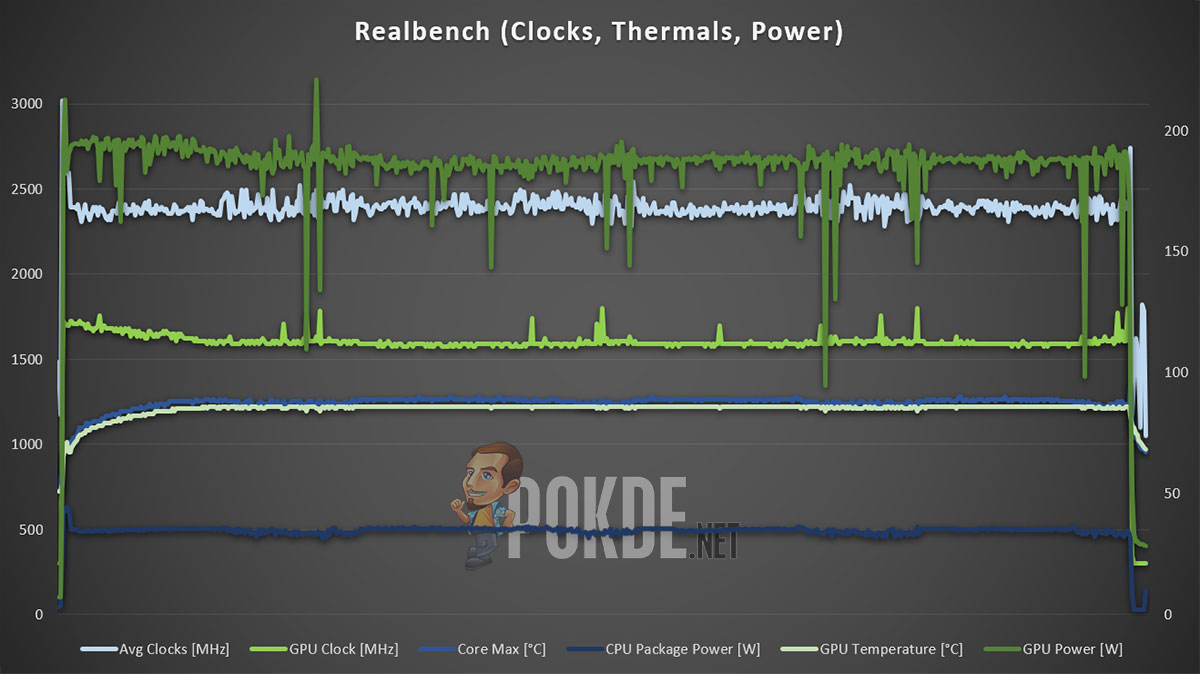 With both the CPU and GPU loaded, we can see that the CPU is given about 35W to play with, while the GPU is given up to 200W of power. As such, thermals are maintained very well, with the CPU running at below 90°C at all times, while the GPU reaches up to 86°C