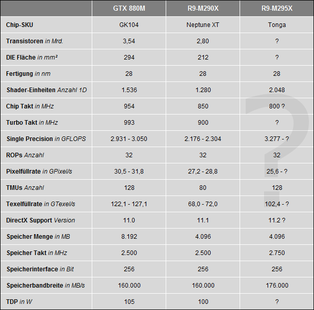 R9 M295X: 2048 shaders @ 800MHz (Still unconfirmed if it have a turbo boost over 800MHz).