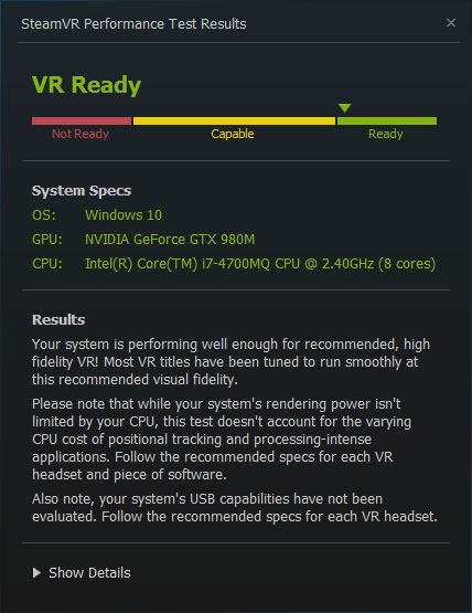 The bad news is at stock settings it's not in the Green, it's in the Yellow, which is apparently still Capable of running SteamVR titles.