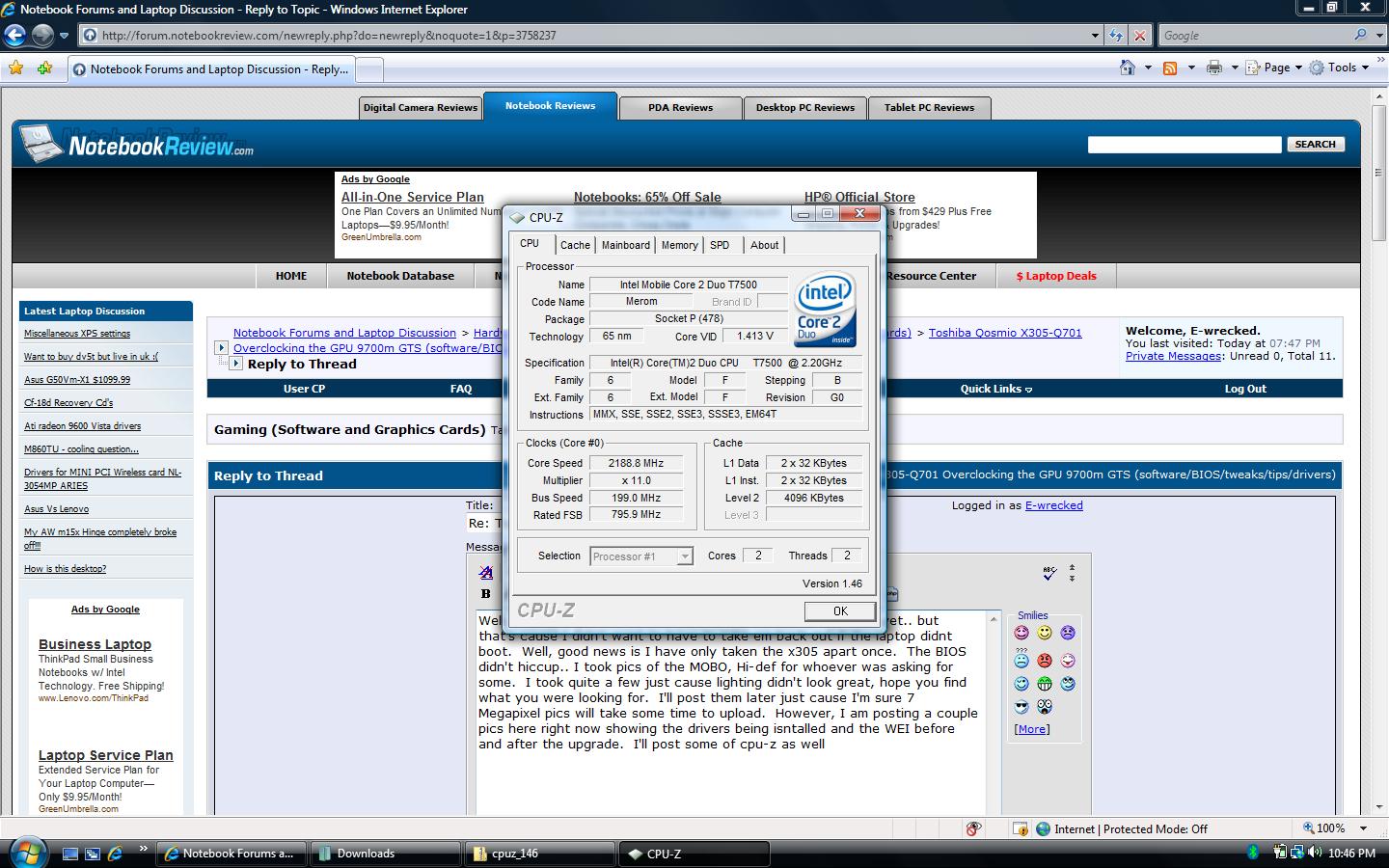 Well, I'm happy to be back! I just don't look forward to swapping the CPUs back to original setup. I'll likely order the CPU that I *want* for the Qosmio, and wait til it comes in to swap back out. Overall, the Toshiba is an easy breakdown..the HP sucked. I'll be happy to provide any benchmarks and what not..just let me know if ya have any questions.