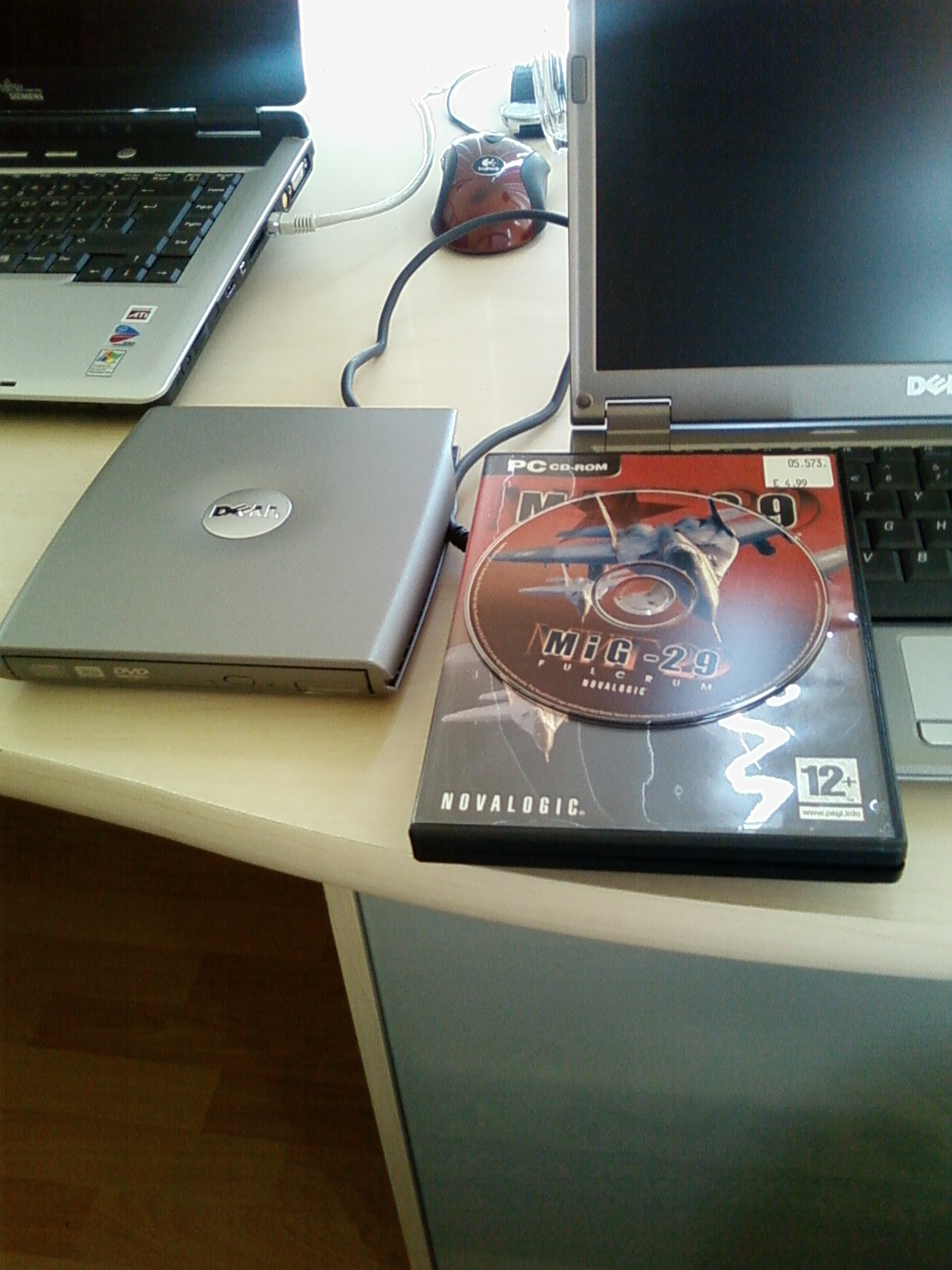 The problem is: I want to play a game named Mig-29 Fulcrum. I have bought this game for 5 euro's here in a store, very cool flight simulator. I also have installed it on my notebook, but when I travel I dont bring my external CD/DVD player with me. This model doesnt have an integrated cd-player. So everytime I start the game it says I must insert my disc.