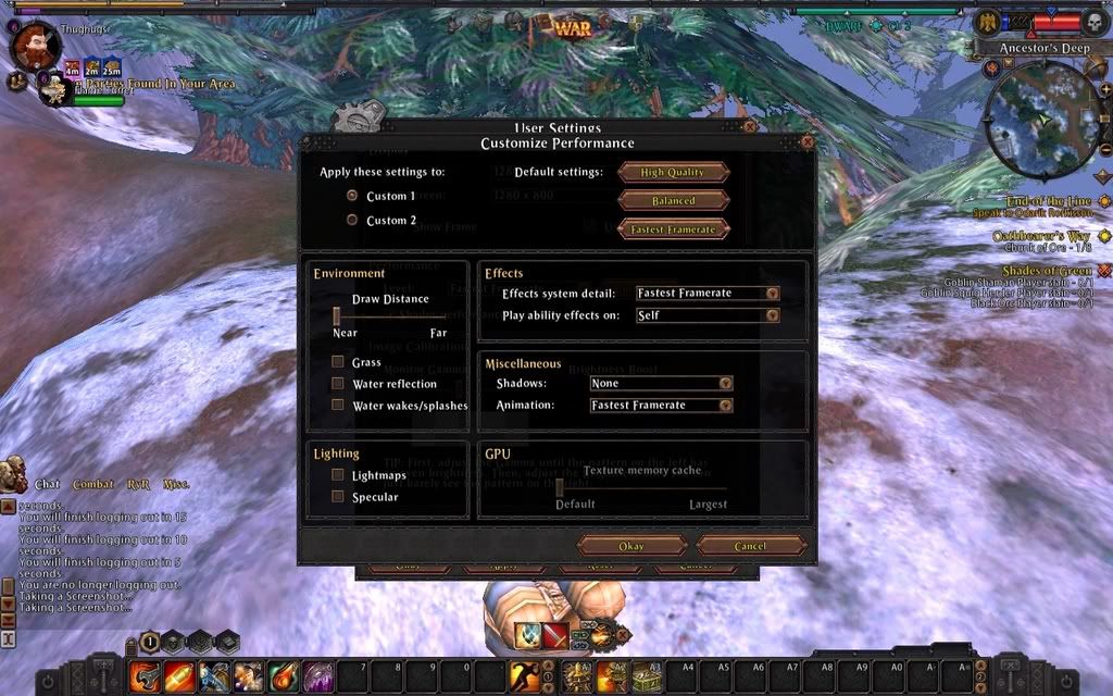 I didn't change any setting i just left it the way it was, i check fraps and mine were at around an average of 16fps i dunno if thats good or bad, i haven't had any problems that i know of and i've done a public quest and RvR thing and didn't experience any lag. oh well its all good. i think i like my dwarf a little better than my drk elf. lol XD.