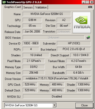 I have a HP dv5t laptop with a nvidia 9200M GS 256Mb graphics card in combination with a 1680x1050 resolution display, running Vista (and Ubuntu)64bit. The graphics performance of my 9200M GS GPU is lower and GPU temperature is higher than expected. These problems were apparent on arrival.