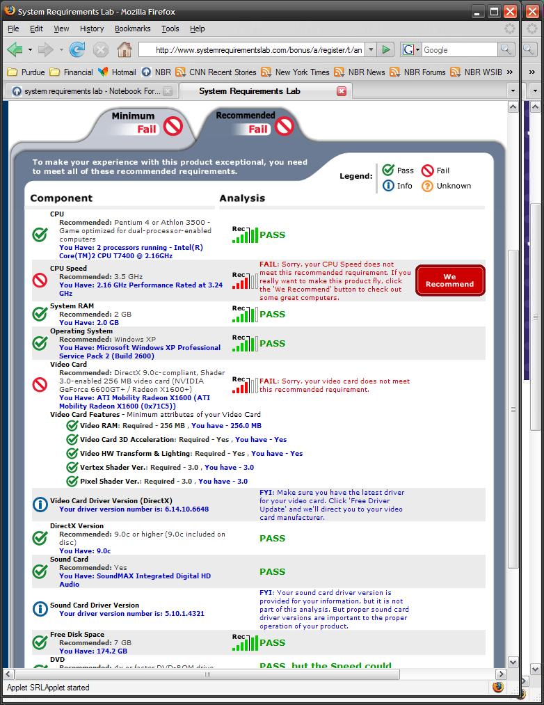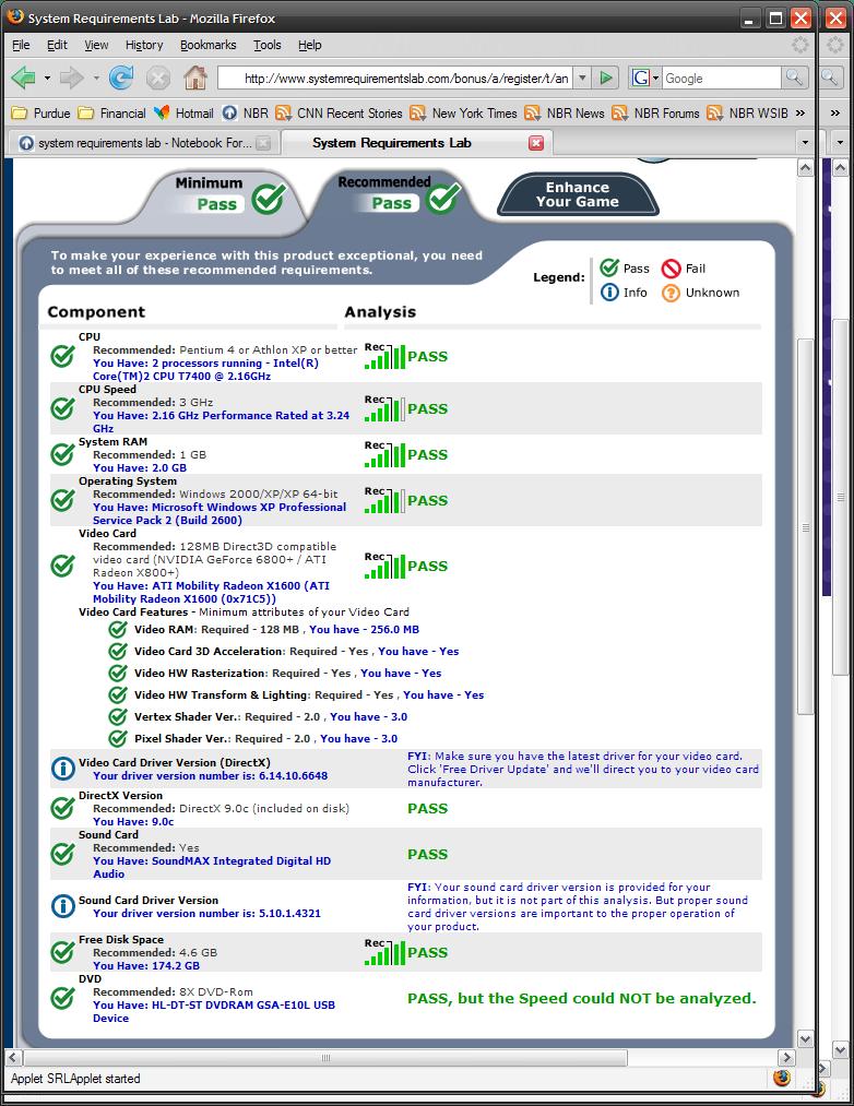 Rainbow 6: Failed for minimum requirements because my card doesn't support 3.0 vertex and pixel shaders. Failed on recommended due to 1GB of ram, and CPU isn't rated high enough.
