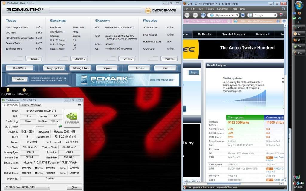 I ran this 3dmark06 @ 698/998/1798 using driver 177.85 from Xfastest, after clean install of driver and control panel :p No OC'ing on the GPU or CPU. By the way, you can clock the 9800m to about 733/1003/1840 and still get good 3dmark06 results. The clocks I gave you are for *stable* useage, such as Crysis or COD4..since their GPU intensive. Some cards are stable with higher clocks, but those are safe clocks and stable. No need to break anything :) Here's the 3dmark results below..